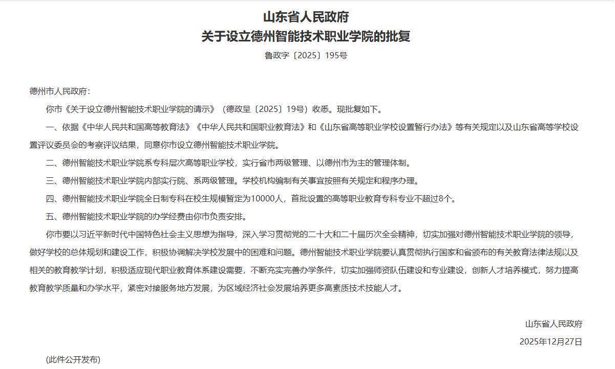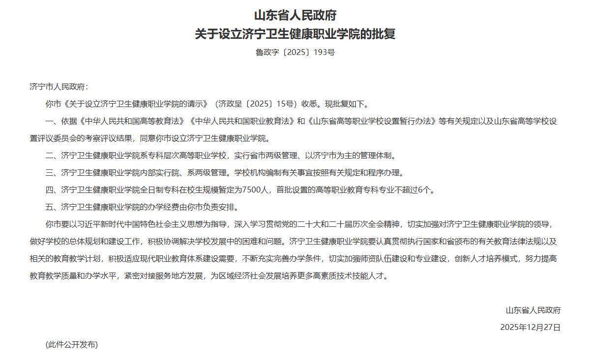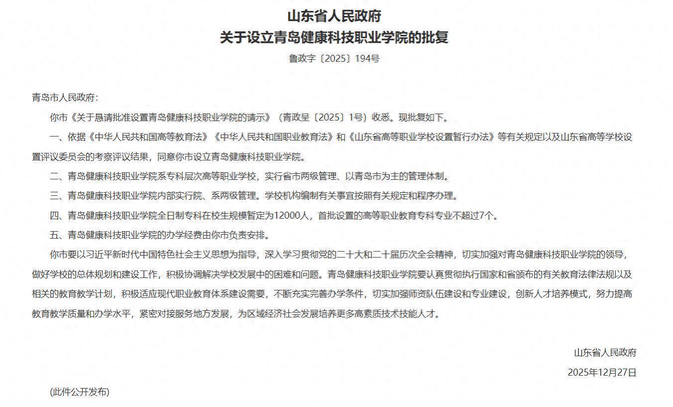 信网1月26日讯1月26日,山东省东说念主民政府荟萃发布4份高校开辟批复文献,讲求甘心开辟济宁卫生健康处事学院、青岛健康科技处事学院、德州智能时代处事学院、滨州健康科技处事学院4所专科档次高档处事学校。