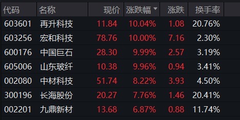 玻璃纤维全天强势,再升科技、宏和科技、中国巨石、山东玻纤等多股涨停。