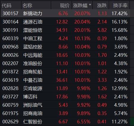 油气设备板块合手续走强,新锦能源、通源石油、潜能恒信20CM涨停,中油工程、蓝焰控股、中远海能、淮油股份、招商汽船等多股涨停。