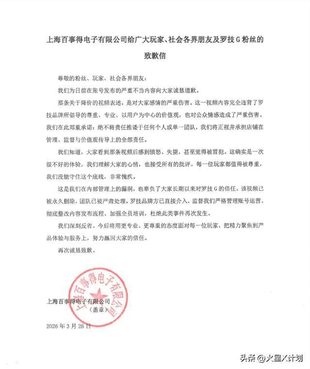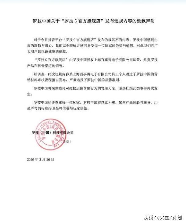 当晚半夜,罗技中国官方微博发布了一纸致歉声明,声明中涌现,涉事的“罗技G官方旗舰店”由授权经销商上海百事得电子有限公司运营。