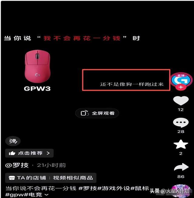 本日,罗技官方旗舰店在抖音账号上发布了一条对于旗下热点鼠标GPW3的推行视频,这本是一次旧例的促销宣传,但视频配文却明白写着:“当我一降价,你还不是像狗相同跑过来”。