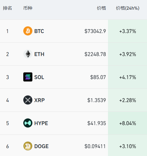 加密货币主要币种集体高潮,比特币涨至73000好意思元/枚上方,日内涨超3%,以太坊日内涨近4%。往时24小时,全商场超13万东说念主被爆仓,爆仓金额3.87亿好意思元。