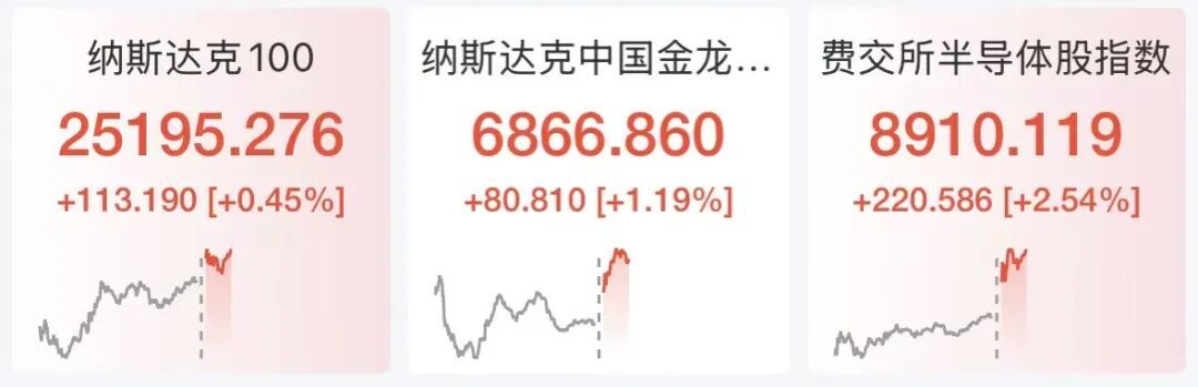 芯片股走势强盛,费城半导体指数涨超2%,ARM、超威半导体、迈威尔科技涨超4%,博通涨超3%,阿斯麦、台积电涨超2%,英特尔、高通涨超1%。