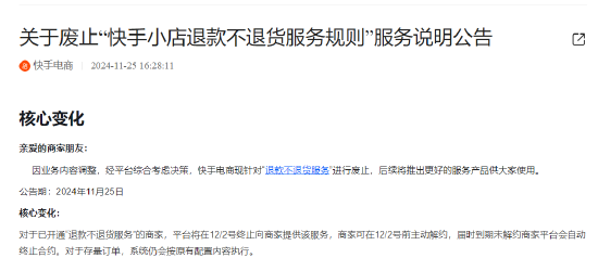 新浪科技讯 11月28日下昼音信,因业务实践调度,快手电商近日告示废止“退款不退货事业”平台战术。关于已绽放“退款不退货事业”的商家,快手电商将在12/2号拆开向商家提供该事业,商家可在12/2号前主动解约,届时到期未解约商家平台会自动拆开合约。关于存量订单,系统仍会按原有树立实践实行。